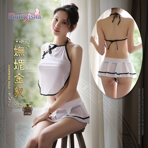 ※ 商品內容:肚兜上衣(背後綁帶式)+短裙(腰部魔鬼氈黏貼)+同系列丁字褲。