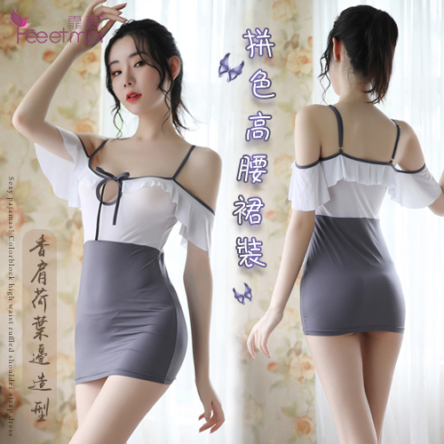 情趣睡衣!拼色高腰荷葉邊香肩吊帶裙裝﹝白+灰﹞
