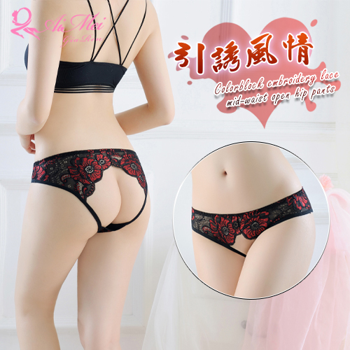 引誘風情!拼色刺繡蕾絲低腰露臀開襠褲﹝紅﹞