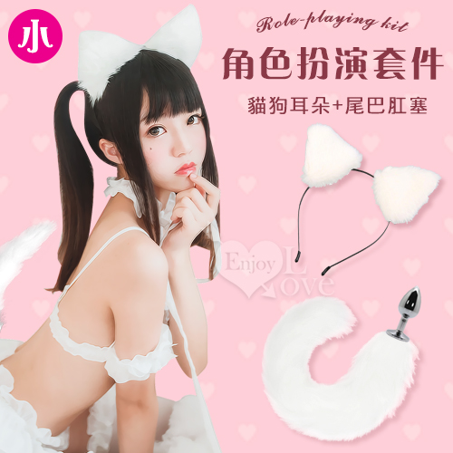 白色毛絨髮卡貓狗耳朵+尾巴肛塞角色扮演套件﹝小號﹞
