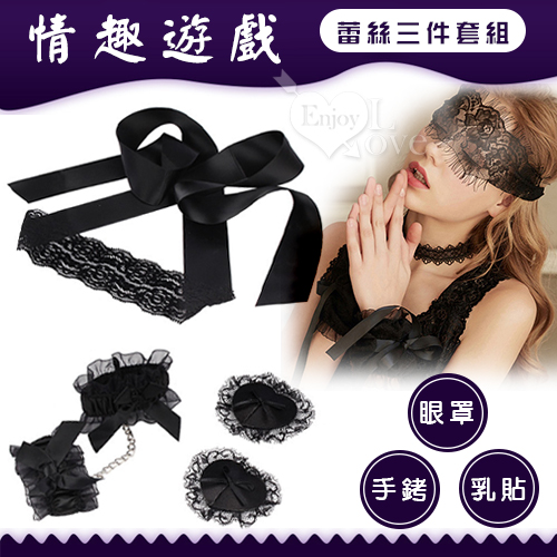 情趣遊戲三件套組 ‧ 蕾絲眼罩+蝴蝶結金屬鍊手銬+蕾絲乳貼