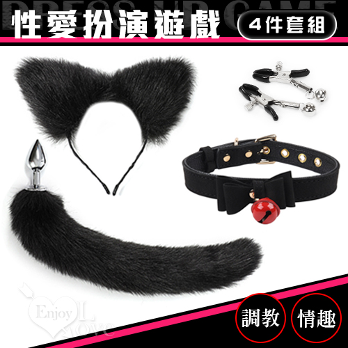 性愛裝扮遊戲4件套組﹝鈴鐺乳夾+狐狸尾巴+毛絨髮箍+皮革鈴鐺頸圈﹞黑