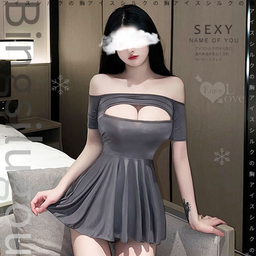 情趣睡衣!冰絲平口肩挖空美胸露溝收腰連身裙兩件組﹝灰﹞