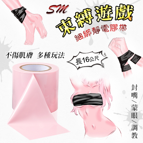 首頁 > SM情趣用品 > 身體束縛 > SM束縛遊戲 ‧ 綑綁靜電膠帶﹝16公尺﹞粉色 - 封嘴/蒙眼/調教