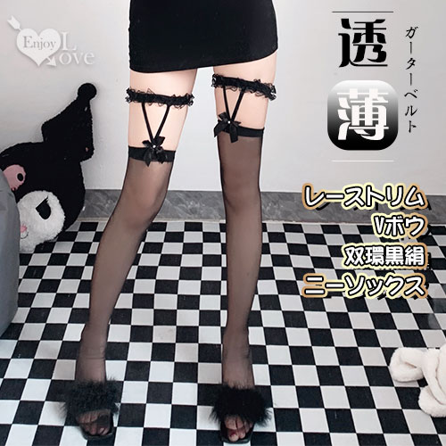 首頁 > 女性情趣內衣/褲 > 性感絲襪/網襪 > 蕾絲滾邊V字蝴蝶結雙環黑絲膝上襪