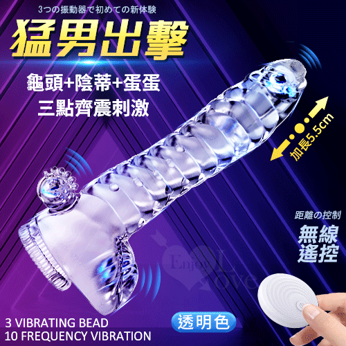 首頁 > 猛男加強專區 > 加長/加粗套-電動型 > MACHO 猛男出擊 ‧ 無線遙控10頻加長增粗震動老二套﹝龜頭+陰蒂+蛋蛋 三點齊震刺激﹞透明色