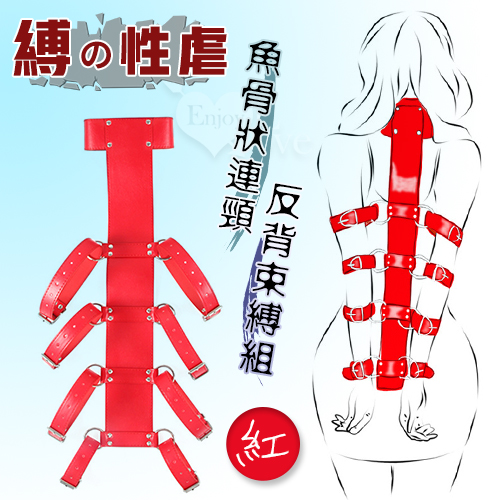 【缚の性虐】魚骨狀連頸反背皮革可調手銬束缚組﹝紅﹞