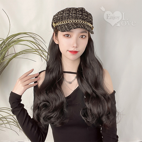 韓系帽子假髮 - 小香風大波浪長捲髮 / 黑髮黑帽