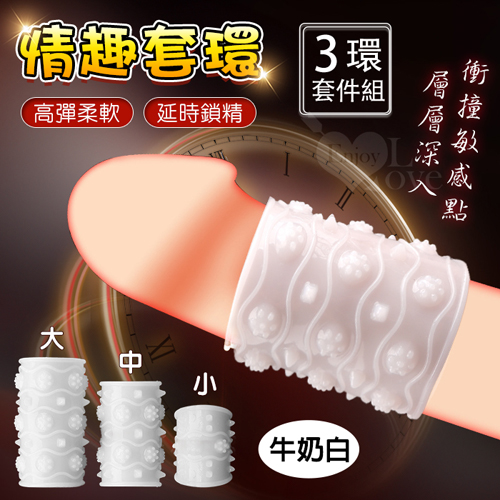 首頁 > 猛男加強專區 > 持久鎖精套環 > 情趣環~大中小3件套 牛奶白﹝柔軟貼合 / 狼牙大小顆粒螺紋設計 / 重覆使用﹞