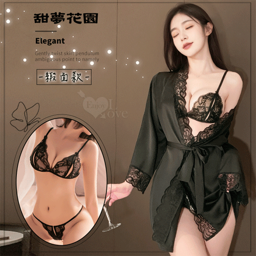 情趣睡衣!蕾絲花邊比基尼百搭睡袍絲綢緞面三件組﹝黑﹞