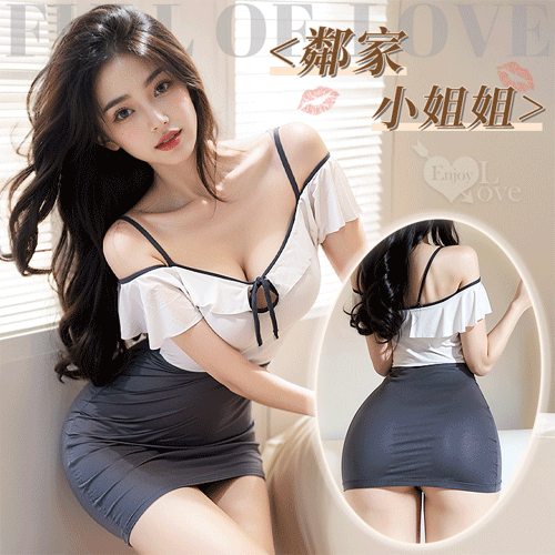 情趣睡衣!清純荷葉邊鏤空綁帶露肩包臀連身裙兩件組