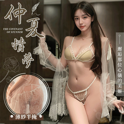 首頁 > 女性情趣內衣/褲 > 情趣比基尼系列 > 鏤空珠串蕾絲情趣套裝|透紗罩衫+珠鏈比基尼+丁字褲三件組